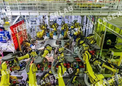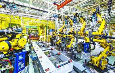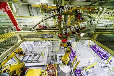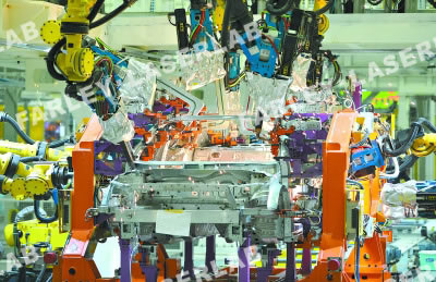 在車身車間,機(jī)器人正在進(jìn)行總拼增焊工序,該車間擁有452臺(tái)機(jī)器人,自動(dòng)化率高達(dá)97%