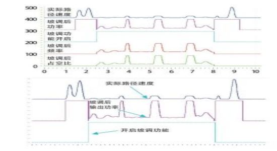 激活坡調(diào)功能后,根據(jù)實(shí)時(shí)數(shù)據(jù)采集可以看出激光器實(shí)際輸出功率、頻率、占空比均可以跟隨路徑速度實(shí)時(shí)變化,三種坡調(diào)功能可根據(jù)實(shí)際需求分別開啟,對(duì)比工件實(shí)際切割效果,切割毛刺改善明顯。