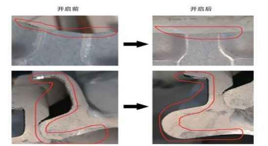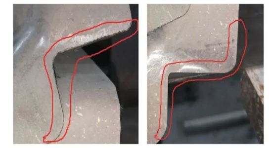 零件實(shí)際生產(chǎn)過程中,受熱壓回彈、投料等因素影響,工件存在不同的狀態(tài),數(shù)模編程與實(shí)際工件存在一定誤差,是導(dǎo)致拐角(圖8)質(zhì)量較差和燒傷的原因。