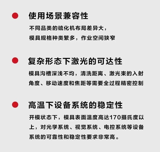 近幾年,隨著新能源汽車的發(fā)展,消費市場對輪胎的性能和質(zhì)量要求也日益提高,輪胎結(jié)構(gòu)設(shè)計和花紋更新迭代加速,形狀復(fù)雜、弧度多、角度多,模具紋理間距極小,模具清洗難度成倍提升。