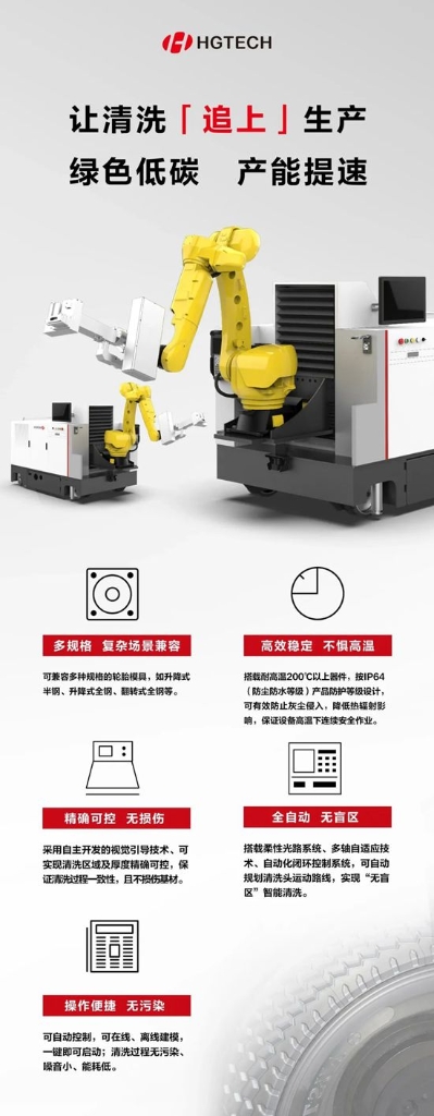 華工科技自主研發(fā)的“輪胎模具激光清洗智能裝備”攻克了激光器、清洗頭、視覺引導(dǎo)技術(shù)等多項核心部件與工藝,無懼高溫“烤驗”,“不拆模”也能讓污垢一掃而光,最快45分鐘即可在線清洗一副輪胎模具,可有效解決傳統(tǒng)清洗方式中“待機時間長、反復(fù)拆卸、模具磨損、清洗不徹底、環(huán)境污染、能耗高”等痛點、難點問題,從而減少硫化機停機時間,提高生產(chǎn)效率及輪胎質(zhì)量,開啟了輪胎模具清洗“低碳、自動化”新時代。