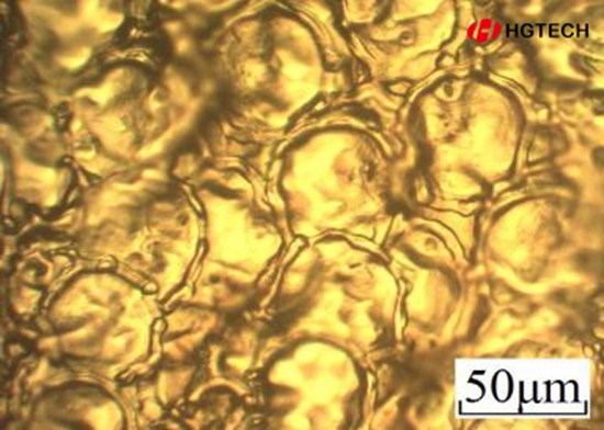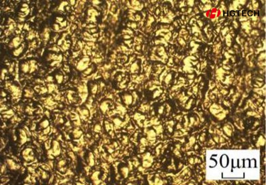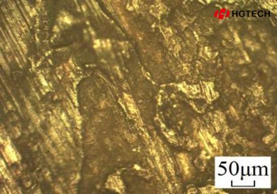 如下圖5,制動(dòng)盤表面未進(jìn)行激光清洗前表面被不均勻銹蝕覆蓋,經(jīng)過最佳激光清洗工藝清洗后,基材表面銹蝕被去除,亮斑相互重疊,在表面形成相互重疊的一個(gè)個(gè)凹坑,將原本銹蝕的區(qū)域清洗干凈。此外,觀察激光清洗后的表面放大500倍,可以看到表面被圓形的亮斑覆蓋形成圓形的清洗區(qū)域,凹坑中部的銹層基本上被清除干凈,并呈現(xiàn)均勻的亮澤。凹坑邊緣部分呈現(xiàn)環(huán)狀凸起形貌,原因是脈沖激光劇烈的沖擊作用下,凹坑中部的金屬流向邊緣處并且堆積起來形成環(huán)狀,相鄰凹坑的環(huán)形部分呈現(xiàn)均勻搭接堆疊,且?guī)缀醪淮嬖阡P斑,表面完全清洗干凈。3.4 表面金相結(jié)構(gòu)分析