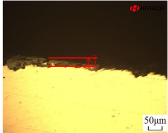 制動(dòng)盤所用材料為Q345E,根據(jù)國標(biāo)GB8923-88的標(biāo)準(zhǔn),對(duì)零件銹蝕程度進(jìn)行判斷,發(fā)現(xiàn)鋼材表面已發(fā)生銹蝕,并且部分氧化皮有銹蝕,因此判斷零件銹蝕等級(jí)為B級(jí)。經(jīng)多次取平均值,測量得到銹層平均厚度約為23μm(如下圖2)。通過材料表面銹蝕程度分析,發(fā)現(xiàn)表面銹蝕程度不均勻,這是由于制動(dòng)盤在工作運(yùn)行中對(duì)表面的磨損與銹蝕程度不同造成的。