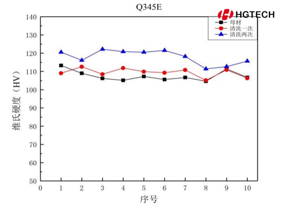 通過清洗前后基材表面硬度值的分布趨勢(shì)進(jìn)行分析。依據(jù)上圖4,清洗后基材表面硬度值分布趨勢(shì)較為波動(dòng),但是硬度平均值高于母材的硬度值??梢园l(fā)現(xiàn)經(jīng)過激光清洗兩次后的表面顯微硬度與母材相比提高了約8%。激光除銹能提高碳鋼表面的硬度,對(duì)防止碳鋼再次氧化和表面強(qiáng)化具有重要意義。