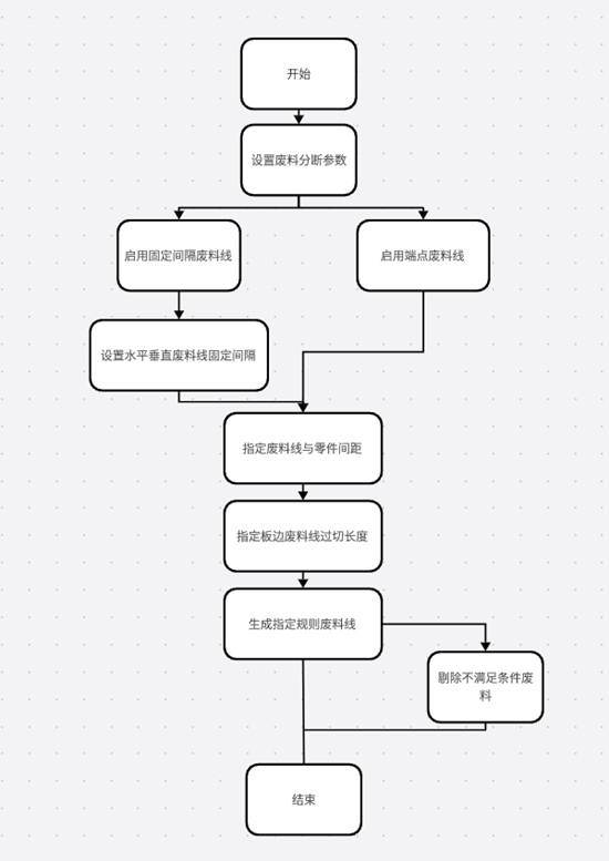 華工激光自主研發(fā)的HGNEST將廢料線定義為兩類,一類是在板材上以固定間隔的形式貫穿整張板材而設(shè)定的廢料線,稱之為定長(zhǎng)廢料線,另一類是從零件端點(diǎn)出發(fā)向周圍發(fā)散從而構(gòu)成的廢料線,稱之為端點(diǎn)廢料線,根據(jù)不同的應(yīng)用場(chǎng)景,可選擇不同的廢料線,一般定長(zhǎng)廢料線設(shè)置的間隔為板材尺寸的十分之一。