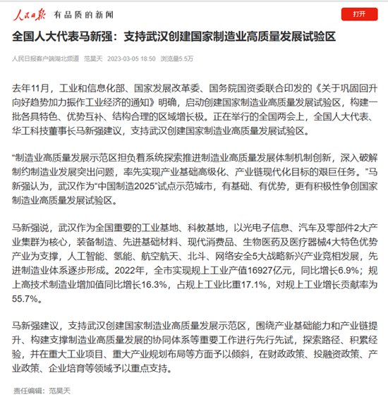 《人民日報》、新華網(wǎng)、央視綜合頻道、中國國際電視臺、21財經(jīng)、《經(jīng)濟日報》、《證券時報》、《中國證券報》、中國工信產(chǎn)業(yè)網(wǎng)、湖北衛(wèi)視、《湖北日報》、《長江日報》等多家媒體關(guān)注馬新強代表的履職情況及華工科技創(chuàng)新發(fā)展。