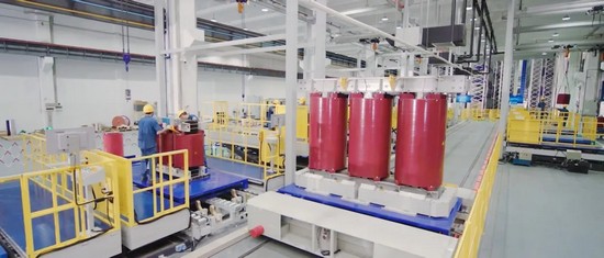 該智能工廠以全面數(shù)智化轉(zhuǎn)型為目標(biāo),將物聯(lián)網(wǎng)、云計算、大數(shù)據(jù)等新一代信息技術(shù)貫穿于設(shè)計、生產(chǎn)、管理、服務(wù)等制造環(huán)節(jié),專注生產(chǎn)電壓等級 35KV 及以下、成品重量不大于 25 噸的干式變壓器。通過對廠房一二樓合理規(guī)劃,引入 AGV 自動輸送系統(tǒng)、RGV 自動輸送系統(tǒng)、自動桁架機械手等自動化物流設(shè)備,實現(xiàn)生產(chǎn)及物料轉(zhuǎn)運流程自動化作業(yè),達(dá)成減人增效目標(biāo)。