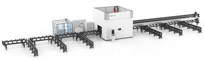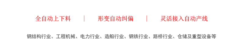實現(xiàn)備料緩存、自動上料、輥道輸送、夾持推進(jìn)送料、夾緊定位、自動變形檢測及糾偏、激光三維切割(型鋼分段切割、端部坡口切割、翼板及腹板上的開孔及坡口切割加工)、自動下料、自動排渣、自動切割及套料,及電氣控制系統(tǒng)等組成